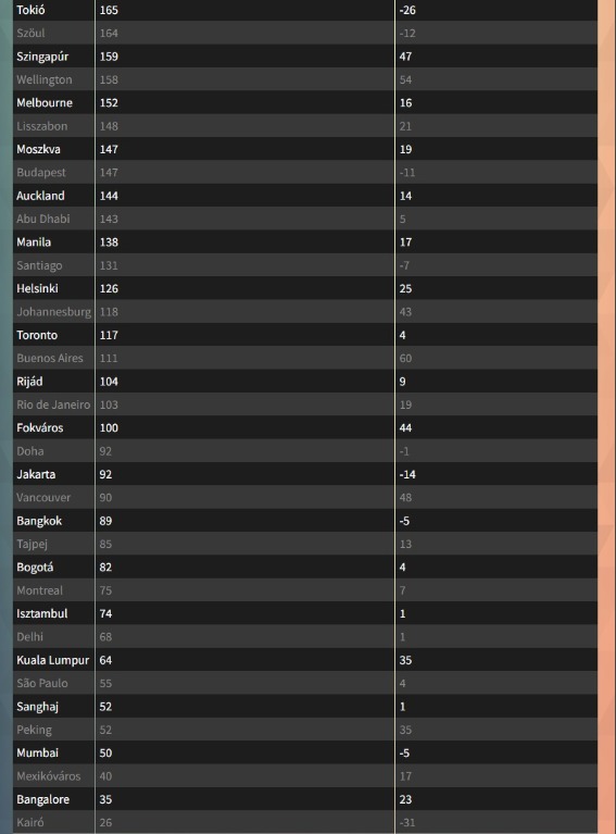 A lista végén álló Kairóban az elmúlt öt évben 31%-kal csökkentek a rezsiköltségek, jelenleg 26 dollár (kb. 8 700 Ft) körül alakulnak havonta. A visszaesés fő oka, hogy az egyiptomi font közel 70%-ot gyengült az amerikai dollárral szemben 2022 óta, amit geopolitikai sokkok és gazdasági egyensúlytalanságok súlyosbítottak. Tokióban szintén kétszámjegyű csökkenés tapasztalható a rezsiköltségekben, elsősorban a gyengülő jen miatt.