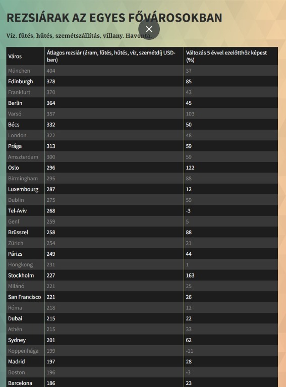 A dokumentum szerint például Varsóban az alapvető közműszolgáltatások - azaz villany, fűtés-hűtés, víz, szemétszállítás - havi átlagköltsége 2025-re 357 dollár lett (kb. 119 000 Ft) - szemben a 2020-as 176 dollárral (kb. 59 000 Ft). Eközben az Egyesült Királyságban több nehéz helyzetbe került vállalkozás bezárt a rekordmagas rezsiárak miatt, amelyeket a orosz–ukrán háború is súlyosbított.